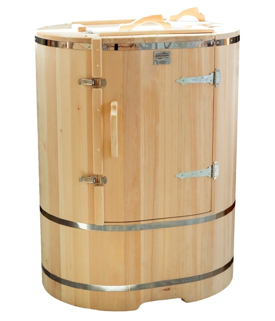 • Кедровая бочка (фитобочка) овальная со скосом «Профессиональная» Овальная фитобочка из кедра - это мини парная, которую можно использовать не только в спа-салонах, но и дома. Овальная модель более просторна и удобна в использовании. Толщина стенок составляет 40-45 мм, что позволяет увеличить срок службы изделия. Верхний скос делает положение головы более комфортным и улучшает обзор. Она оборудована откидными створками, дверцей и отверстием для головы. Во время парения человек сидит внутри кедровой бочки, а голова находится снаружи. Благодаря этому исключается возможность перегрева. Подлокотники из кедра, встроенные ручки на створках и двери делают эксплуатацию более удобной. Парение в фитобочке благотворно влияет на организм в целом: повышается иммунитет, выводятся шлаки и токсины, улучшается работа органов тела и состояние кожи.