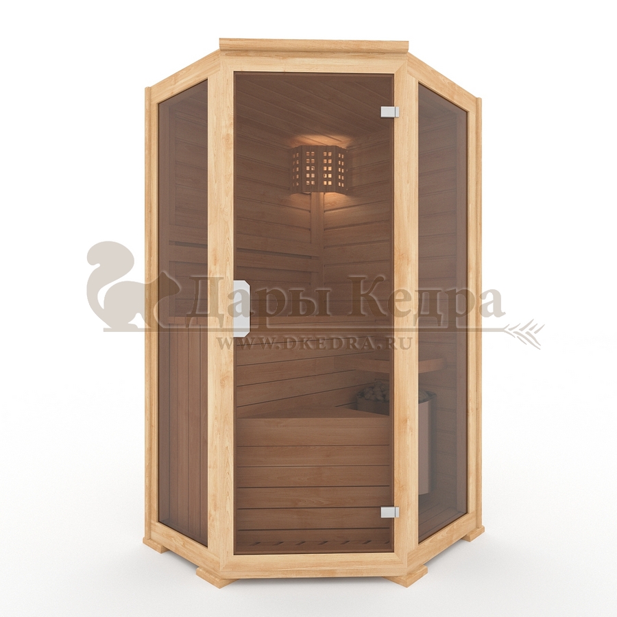 • Одноместная угловая финская сауна кабина из кедра с электрокаменкой Это специально оборудованная деревянная кабина для сухого и влажного парения. Электропечь нагревает пространство внутри и позволяет сбрызгивать камни водой, слегка увлажняя воздух. Такая процедура позволяет избежать перегрева. Двойные стенки кабины с теплоизоляционным материалом удерживают тепло. Установка сауны в угол позволяет рационально использовать пространство помещения. Финская сауна с электропечью подойдет как для домашнего использования, так и для коммерции. Доставляется в разборном виде щитами, собирается по инструкции с помощью шуруповёрта. Обращаем Ваше внимание, что в стоимость сауны уже включена дверь с закаленным стеклом в раме из кедра с фиксатором и деревянным фасадом. Вы можете заменить фасад на цельностеклянный с безрамной дверью за дополнительную плату. Нагреваясь, древесина кедра выделяет полезные вещества-фитонциды, которые благотворно влияют на организм в целом и укрепляют иммунитет.