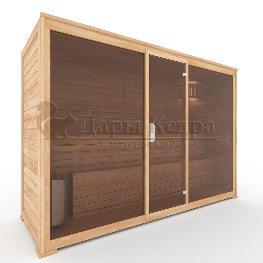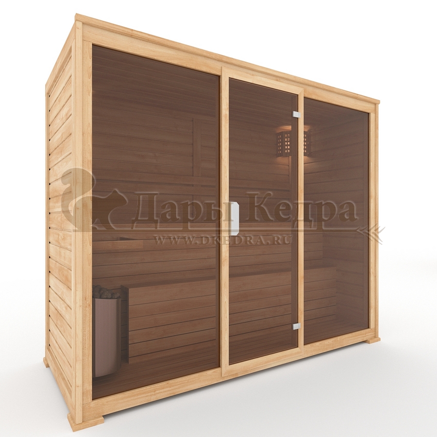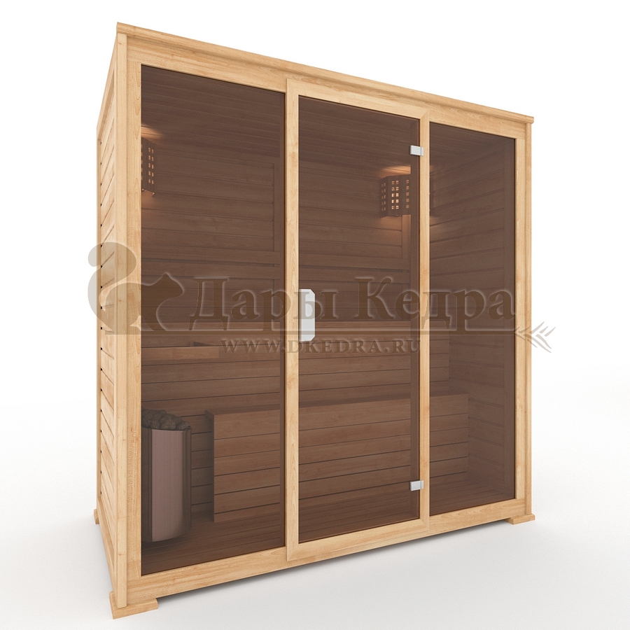 • Четырехместная финская сауна кабина из кедра с электрокаменкой Это специально оборудованная готовая деревянная кабина для сухого и влажного парения. Электропечь нагревает пространство внутри и позволяет сбрызгивать камни водой, слегка увлажняя воздух. Такая процедура позволяет избежать перегрева. Сауна обшита снаружи и внутри кедровой вагонкой и имеет теплоизоляционный слой. Финская сауна с электропечью подойдет, как для домашнего использования, так и для коммерции. Доставляется в разборном виде щитами, собирается по инструкции с помощью шуруповёрта. Обращаем Ваше внимание, что в стоимость сауны уже включена дверь с закаленным стеклом в раме из кедра с фиксатором и деревянным фасадом справа. Вы можете заменить фасад на цельностеклянный с безрамной дверью за дополнительную плату. Нагреваясь, древесина кедра выделяет полезные вещества-фитонциды, которые благотворно влияют на организм в целом и укрепляют иммунитет.