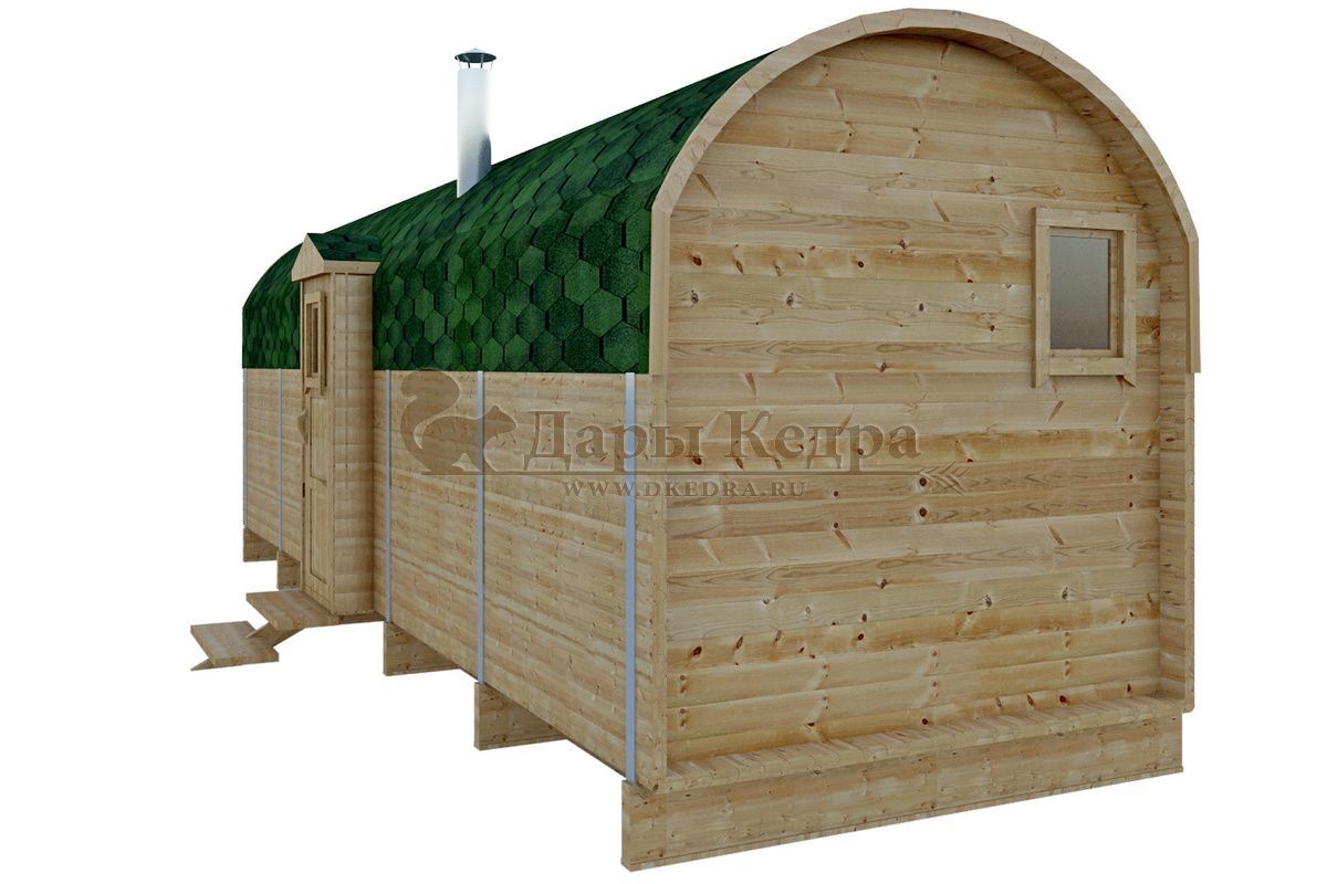 • Баня-бочка буханка из кедра с козырьком (все размеры) Баня-буханка более просторная за счет увеличенной высоты потолков и ровного пола. Козырек не только украшает баню, но и защищает оставленную обувь от дождя. Лавочки из кедра находятся по всей длине бани-бочки с обеих сторон. Печь расположена в парилке около дальней стены. Время растопки такой бани не превышает 30 минут. В зависимости от выбранного размера баня-бочка буханка с козырьком имеет следующую комплектацию: Баня-бочка буханка 2,5 метра - парилка; Баня-бочка буханка 3,5 и 4,5 метра - раздевалка, парилка; Баня-бочка буханка 5,5 метров - раздевалка, парилка, моечная. По вашему желанию ее можно укомплектовать печью с внешней загрузкой, благодаря которой весь мусор вовремя топки остается на улице. Баня-бочка буханка не требует полноценный фундамент, поэтому при необходимости ее можно перенести в другое место. Обращаем Ваше внимание, что в стандартную комплектацию бани входят полки открытого типа в парной с обеих сторон. Дополнительно можно заказать полок закрытого типа или лавку! Кедр обладает ароматическими свойствами. Он не деформируется и влагоустойчив, при правильном уходе за деревом на нем не развиваются грибки и плесень.