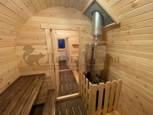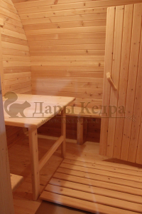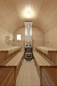 Баня-буханка более просторная за счет увеличенной высоты потолков и ровного пола. Козырек не только украшает баню, но и защищает оставленную обувь от дождя. Лавочки из кедра находятся по всей длине бани-бочки с обеих сторон. Печь расположена в парилке около дальней стены. Время растопки такой бани не превышает 30 минут. В зависимости от выбранного размера баня-бочка буханка с козырьком имеет следующую комплектацию: