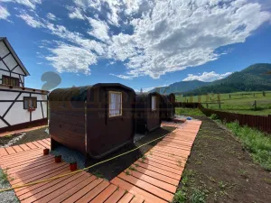 Мобильная баня-бочка с каждым днем набирает все большую популярность благодаря её возможной транспортировки куда угодно: на отдых в лесу, на рыбалку или на побережье реки