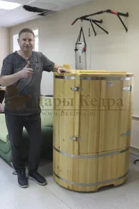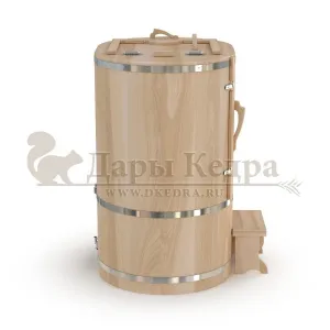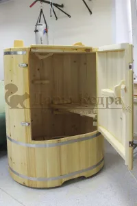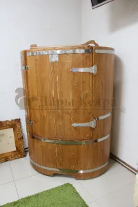 Овальная фитобочка из кедра - это мини парная, которую можно использовать не только в спа-салонах, но и дома. Овальная модель более просторна и удобна в использовании. Толщина стенок составляет 25 мм. Она оборудована откидными створками, дверцей и отверстием для головы. Во время парения человек сидит внутри кедровой бочки, а голова находится снаружи. Благодаря этому исключается возможность перегрева. Подлокотники из кедра, встроенные ручки на створках и двери делают эксплуатацию более удобной.