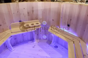 Эффектная подсветка, посредством встроенной, влагозащищённой светодиодной ленты класса IP68. Идеально подходит для круглых купелей. Источник света скрыт от глаз, яркость освещения и цвет можно менять с пульта на расстоянии до 5 метров. Также есть автоматический режим плавной смены цветов, похожий на северное сияние. Хотите удивить близких и друзей? Тогда это ваш вариант!