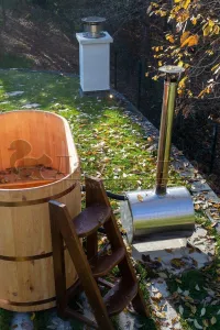 Это уличная баня, которой можно пользоваться круглый год. Купель представляет собой овальную емкость для воды, внутри которой располагаются сиденья из кедра. Подогрев воды осуществляется за счёт внешней печи с дымоходом, которая подключается с помощью шлангов с выходом внутри термостойких форсунок. Для удобства пользования японская баня фурако оборудована внешней и внутренней лестницей из кедра.