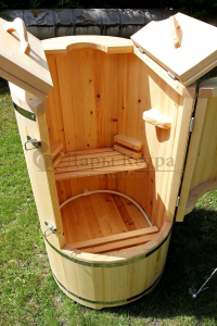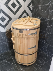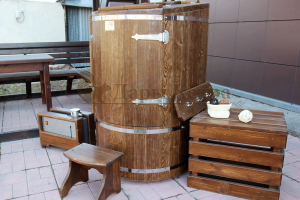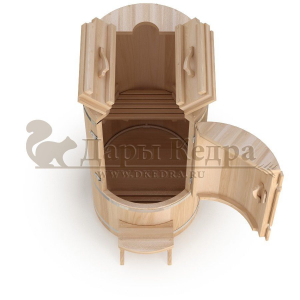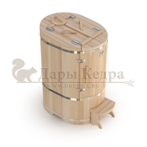 Готовый комплект - это полностью укомплектованный набор с фитобочкой для процедур парения. Овальная модель более просторна и удобна в использовании. Толщина стенок составляет 40-45 мм, что позволяет увеличить срок службы изделия. Верхний скос делает положение головы более комфортным и улучшает обзор. Фитобочка оборудована откидными створками, дверцей и отверстием для головы. Во время парения человек сидит внутри кедровой бочки, а голова находится снаружи. Благодаря этому исключается возможность перегрева. Подлокотники из кедра, встроенные ручки на створках и двери делают эксплуатацию более удобной.