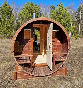 Стильная и современная баня-бочка может быть выполнена длиною от 3 метров, что-бы парильное отделение было не менее 2,5 метров для безопасного расстояния человека от печи. Полок одноуровневый, что позволяет в полной мере наслаждаться видом из панорамного окна. Печь идёт с внутренней топкой по центру, её можно установить сбоку с топкой внутри, снаружи, либо вынести топку в соседнее отделение. Печь можно укомплектовать баком для воды, а саму баню сделать длиною до 6 метров, комфортно разместив в ней дополнительно помывочную и комнату отдыха.