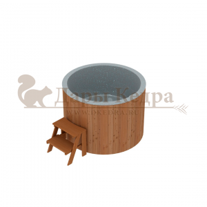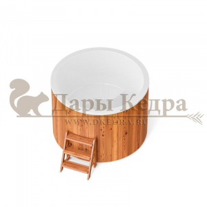 Это купель с круглой внутренней чашей, которая изготовлена из современного прочного и термоустойчивого материала (композита). Форма чаши обеспечивает комфортную посадку внутри изделия. Для удобного использования купель оснащена приставной лестницей. Обручи из нержавеющей стали декорируют купель с композитом и равномерно распределяют нагрузку во время процедур.