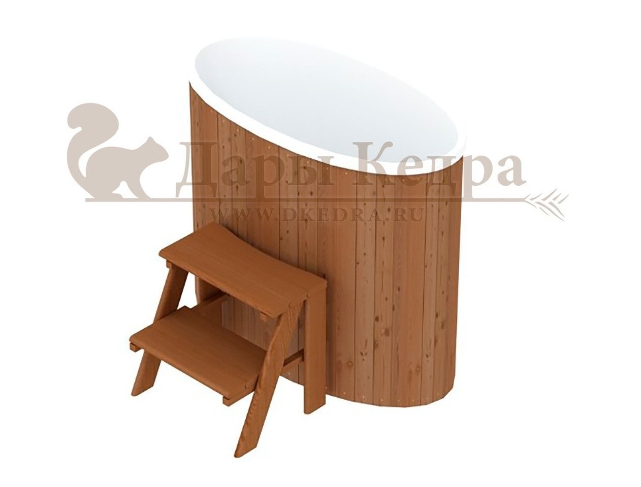 Это купель с внутренней овальной чашей, которая изготовлена из современного прочного и термоустойчивого материала (композита). Форма чаши обеспечивает комфортную посадку внутри изделия. Для удобного использования купель оснащена приставной лестницей. Обручи из нержавеющей стали декорируют купель с композитом и равномерно распределяют нагрузку во время процедур.